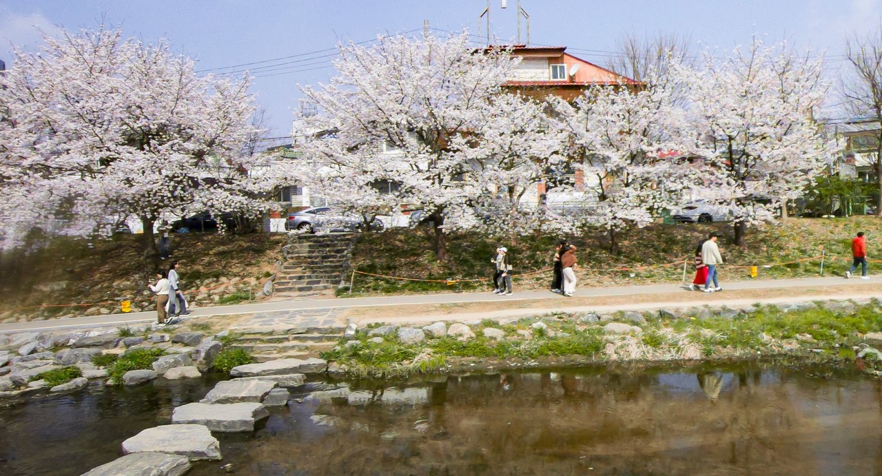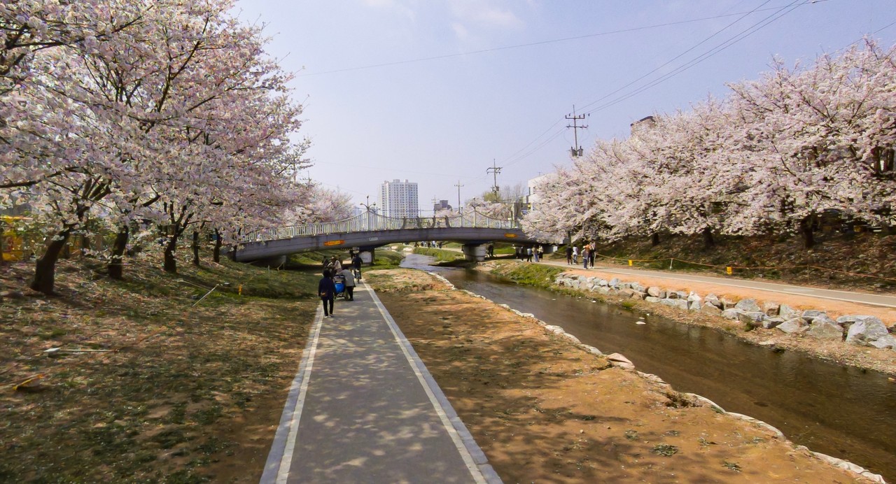 천안시 원성천 벚꽃길은 천안의 대표적인 봄꽃 명소로, 하천을 따라 약 1.5km의 벚꽃 터널이 펼쳐지는 아름다운 산책로입니다.